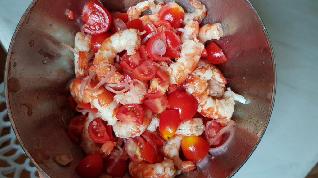 - Cuocere i gamberi in acqua bollente leggermente salata per pochi minuti (finché diventano rosati).