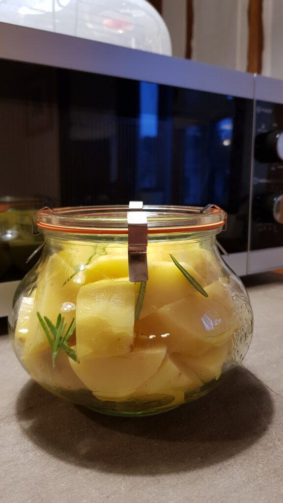 Tagliate le patate spellate a pezzi medi, mescolateli in una terrina con un po’ di olio, rametti di rosmarino fresco e uno spicchietto di aglio. Riempite un vaso da litro, chiudete e agganciate. Cuocete in microonde per circa 15 minuti. Lasciate riposare per circa 20 minuti poi potete gustarlo subito riscaldandolo per 3 minuti alla massima potenza senza ganci per far stappare il vaso oppure riporlo in frigo e consumarlo entro 2-3 giorni.