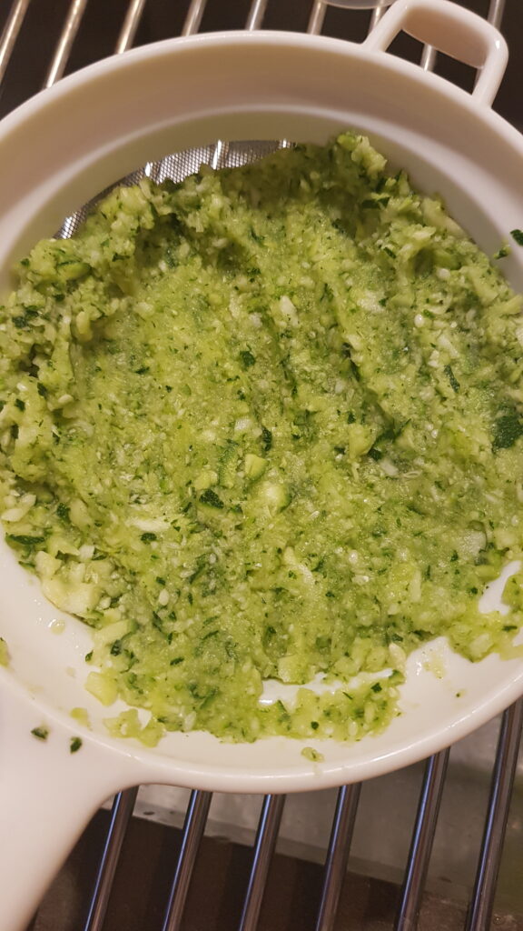 Lavate e mondate le zucchine, eliminate le estremità e grattugiatele o tritatele finemente con un mixer dotato di lama per julienne. Strizzatele leggermente con un panno pulito o con un colino per eliminare l’acqua in eccesso: questo passaggio è importante per ottenere un impasto equilibrato e non troppo umido.